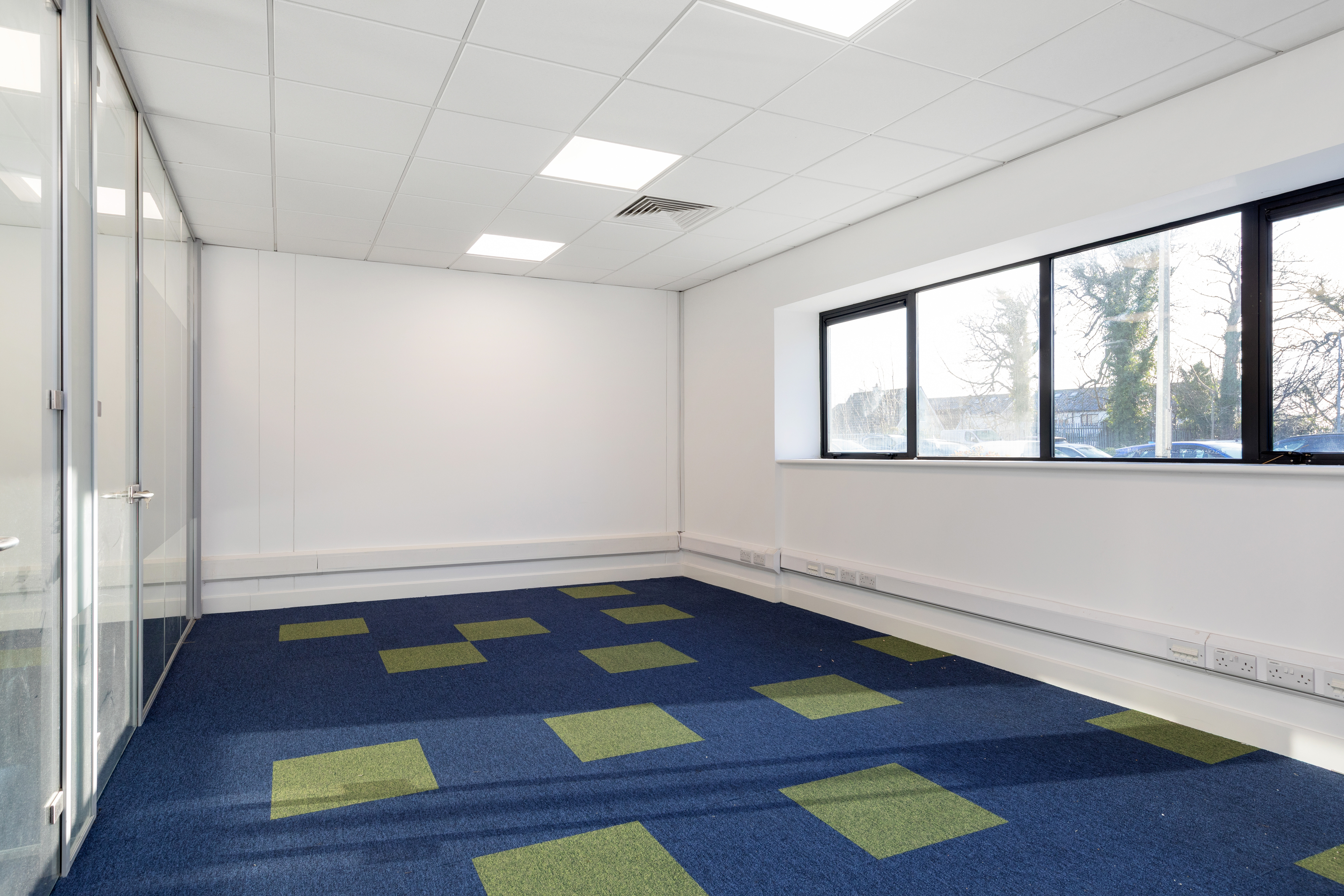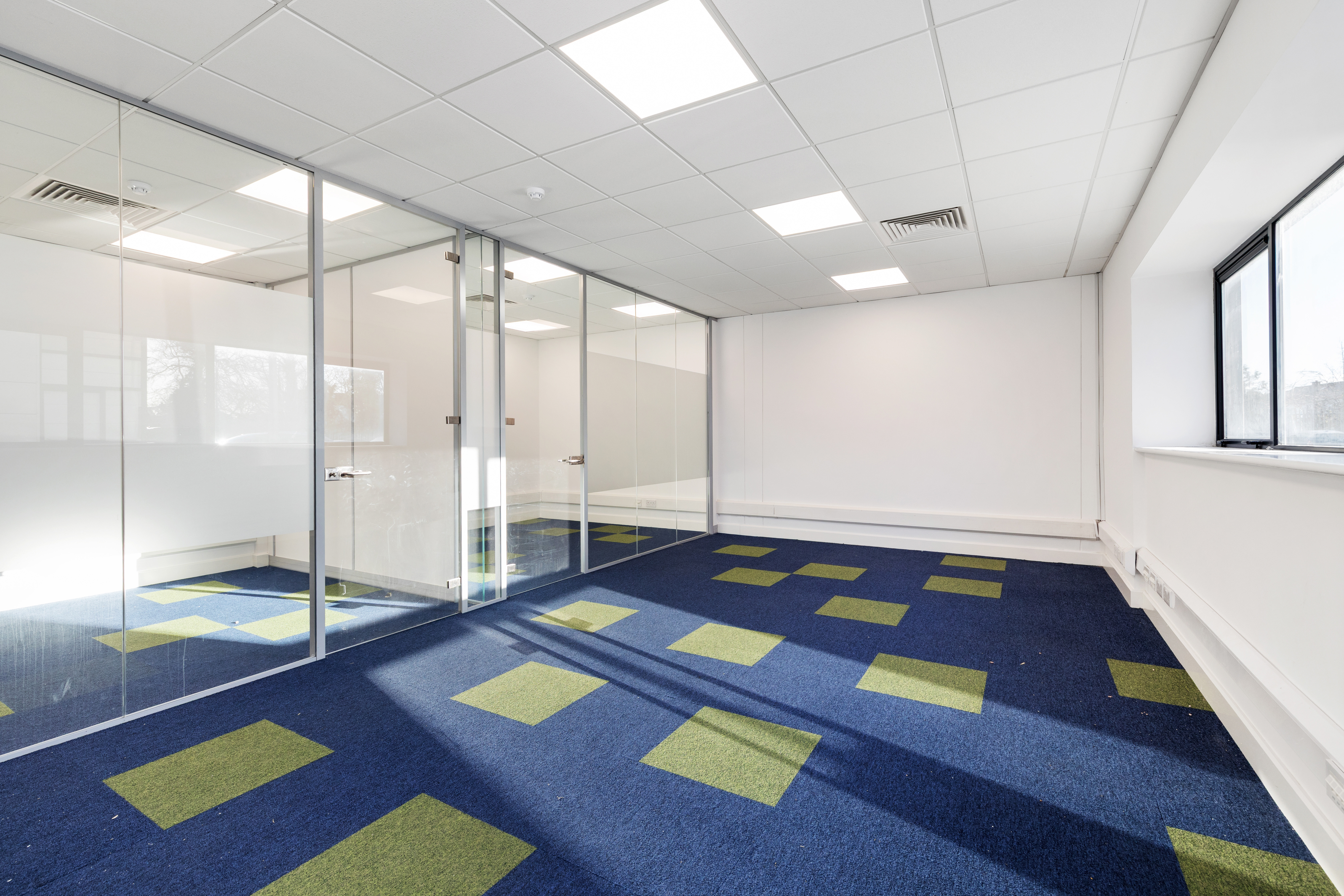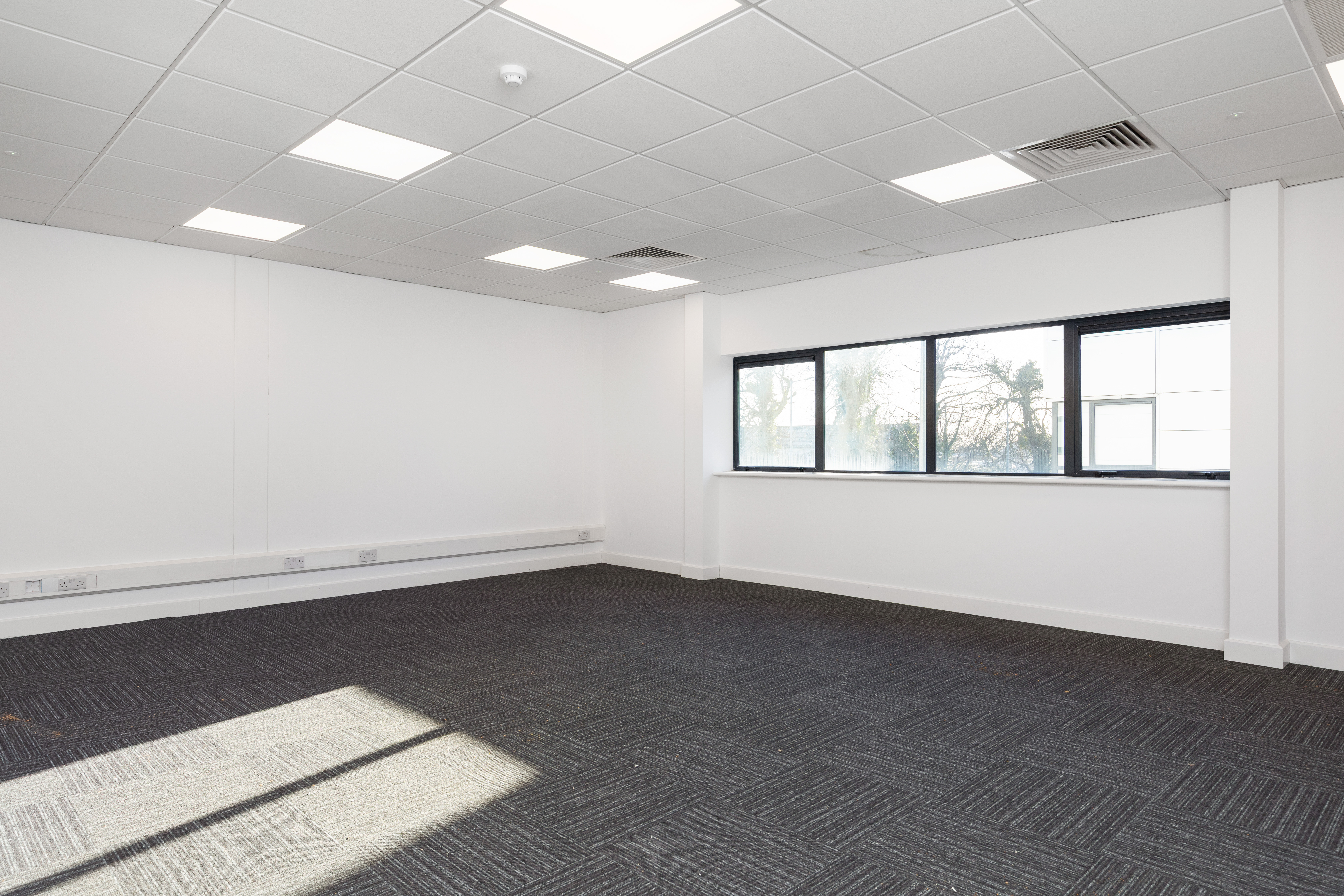 Wheelchair-accessible toilet on the ground floor, additional toilet on the first floor, carpeted flooring throughout, plastered and painted walls, double-glazed windows, perimeter trunking, alarm systems, suspended ceilings with LED lighting and a kitchenette.