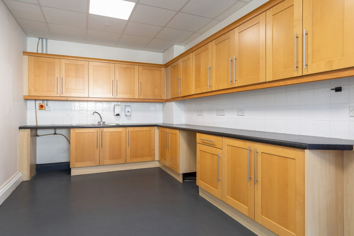 The ground floor is laid out to provide open-plan workspace, a fully fitted canteen, multiple meeting rooms, and accessible WC facilities. The first floor accommodates a mix of cellular offices, additional meeting rooms, and ancillary storage. Externally, the property includes 33 on-site surface car-parking spaces and dedicated bicycle stands at the main entrance.